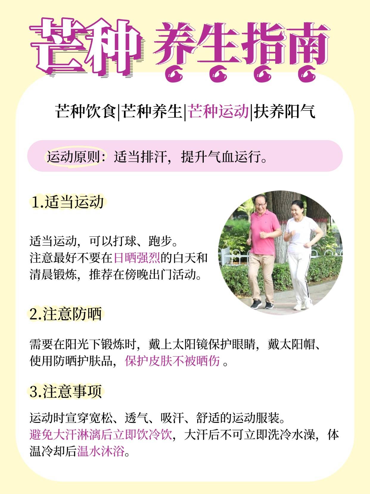 芒种养生指南 创始人 更新于 2025-06-05 09:34:09 首发于 2025-06-05 09:34:32 健康资讯 0 饮食原则:清淡祛湿,清热生津。 养生原则:防暑祛湿,增强体质。 运动原则:适当排汗,提升气血运行。 养阳原则:补阳精气,调养精神。 未经允许不得转载: 办公健康网 » 芒种养生指南