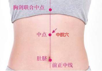 定位:中脘穴当人体前正中线上,脐中上4寸。脐中央与胸骨体下缘两点之中央(脐上4寸)即是本穴。