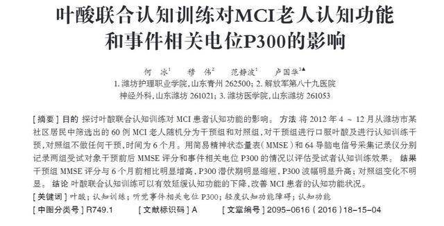 [1]何冰,穆伟,范静波,等.叶酸联合认知训练对MCI老人认知功能和事件相关电位P300的影响[J].中国医药科学,2016