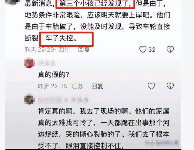 目击者表示:“最新消息,第三个小孩其实已经发现了,但是由于地势条件非常的艰险,应该明天就要上岸,事故的原因主要是因为车胎破了,由于缺乏经验没有及时发现,导致车轮直接断裂,车子也失控了。”