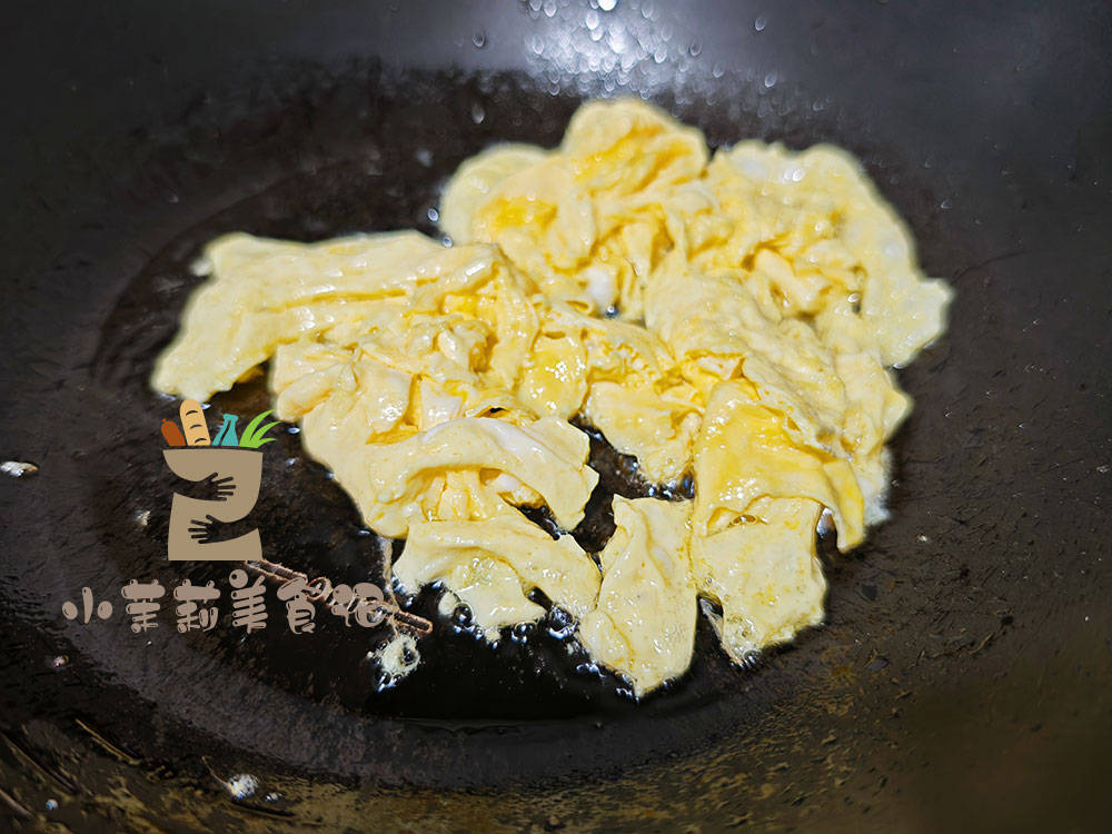2、它可以素炒,当然搭配鸡蛋更鲜美,先把鸡蛋炒熟了,从里边盛出来。底油里边要多加些蒜,瓜类要靠蒜来提升香味儿。
