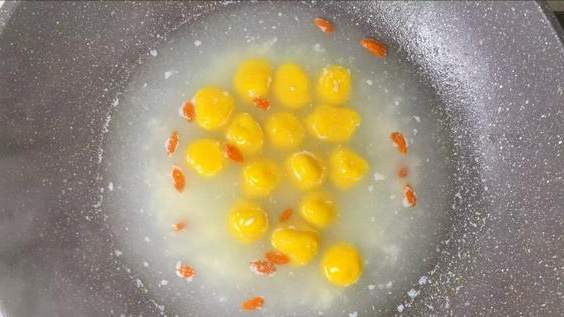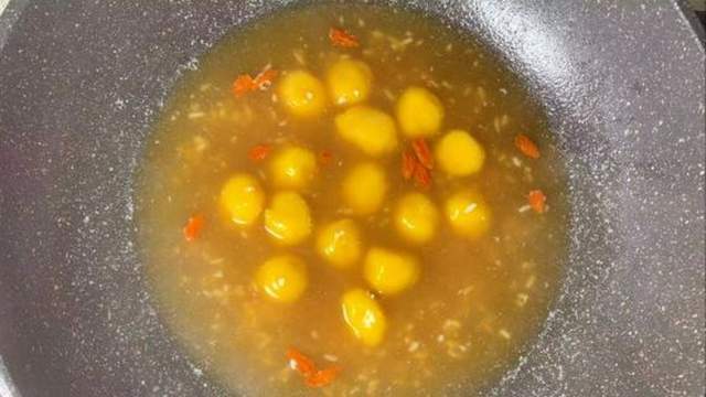4、锅里重新加水(水量看你喜欢喝稠的还是稀的),烧开。放入几勺灵魂酒酿(甜米酒),搅匀煮开,那股甜丝丝、带点微醺的独特香气立刻飘满厨房。接着抓一小把红艳艳的枸杞丢进去,再把过完凉水的南瓜丸子也倒回锅里。