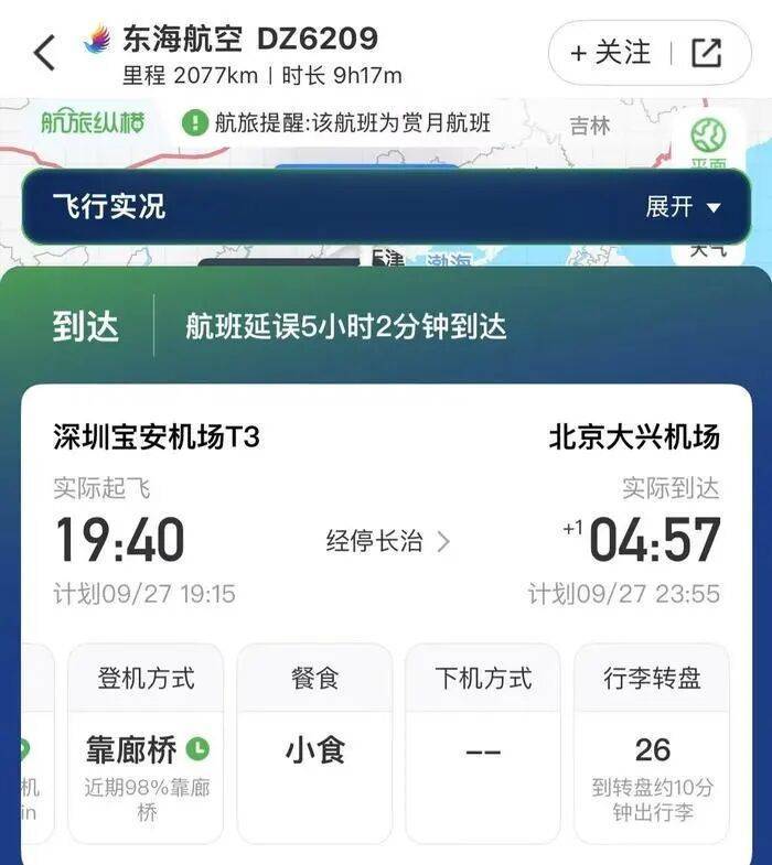 据航旅纵横航班信息,东海航空9月27日DZ6209航班19:15从深圳宝安机场起飞,经2小时7分抵达长治,执飞飞机编号B1105,原计划22:40从长治起飞,用时52分钟于23:55抵达北京大兴机场,实际航班信息显示延误5小时2分抵达,实际是28日4:05从长治起飞,4:57抵达北京大兴机场,执飞飞机编号B1770。