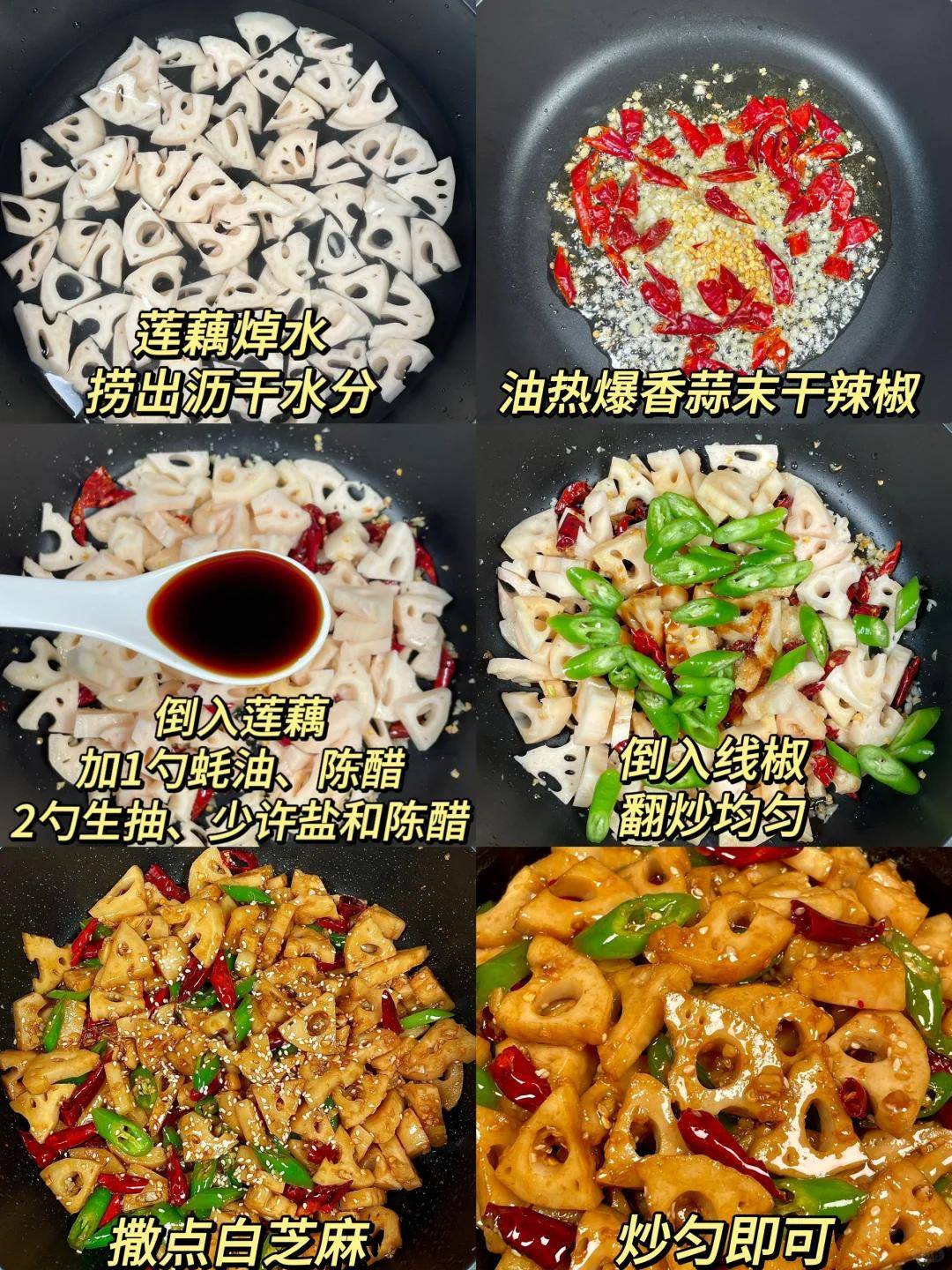 锅中倒入适量食用油,油热吼倒入蒜末、干辣椒爆香,再把莲藕倒入锅中翻炒,加入1勺蚝油、陈醋、2勺生抽、少许盐调味,再把辣椒倒入锅中翻炒即可。