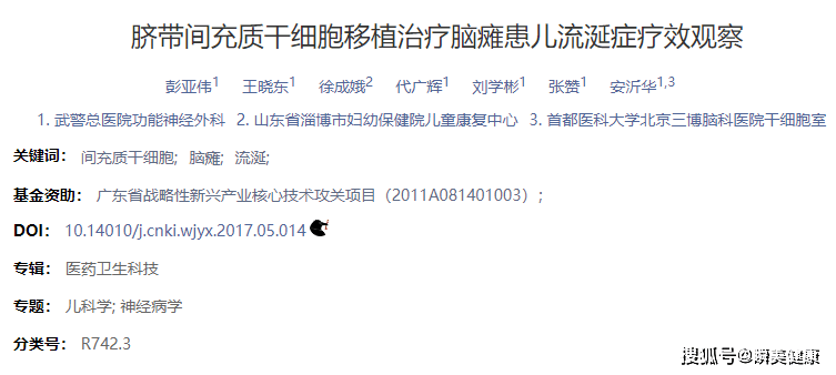 小儿脑瘫是出生后一个月内非进行性脑损伤所致综合征。2017年我国研究显示,脐带间充质干细胞4次腰椎穿刺移植可显著改善脑瘫患儿流涎症,提高生活质量。