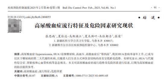 张思雨,夏依达·乌斯满江,夏木斯叶·木依都力,张荣,高尿酸血症流行特征及危险因素研究现状,疾病预防控制通报,2025-01-22