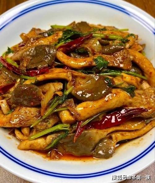 3、另起锅烧油,放入蒜片、干辣椒炒香,再加入一勺孜然粉、辣椒面,小火炒出香味,然后倒入焯好水的蘑菇,调味加盐、糖、鸡精、生抽、蚝油,再放一把蒜苗叶,翻炒至入味就可以出锅了。