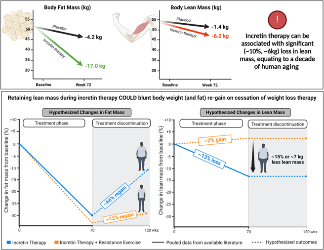 另一方面,GLP-1RA也带来了一些不容忽视的代谢副作用,尤其是瘦体质量(包括肌肉)的流失。在老年人或久坐人群中,肌肉损失可能进一步破坏葡萄糖稳态,反而增加癌症发生的风险。尽管有观点认为这种肌肉减少属于“适应性改变”,但更多证据指向其潜在的不良后果。因此,在临床使用时,应结合抗阻训练和充足的蛋白质摄入,以最大限度地实现减重与肌肉保护的双重目标。