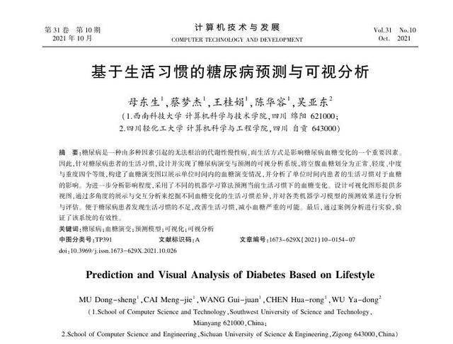[1]母东生,蔡梦杰,王桂娟,等.基于生活习惯的糖尿病预测与可视分析[J].计算机技术与发展,2021,31(10):154-160.