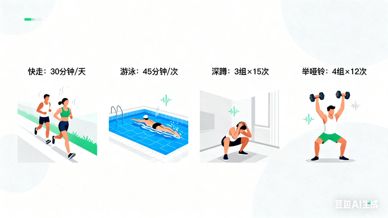 1. 有氧运动作为基础:每周至少5天,每天坚持30分钟以上的中等强度有氧运动——快走、慢跑、游泳、骑自行车等,运动强度以达到心率加快、微微出汗但仍能正常交谈为宜。