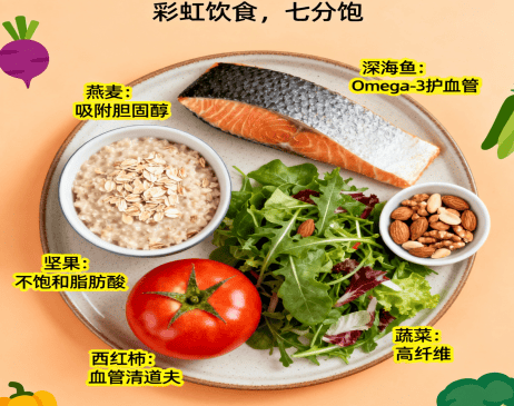 记住一个口诀:"彩虹饮食,七分饱,少油炸,多蒸煮"。