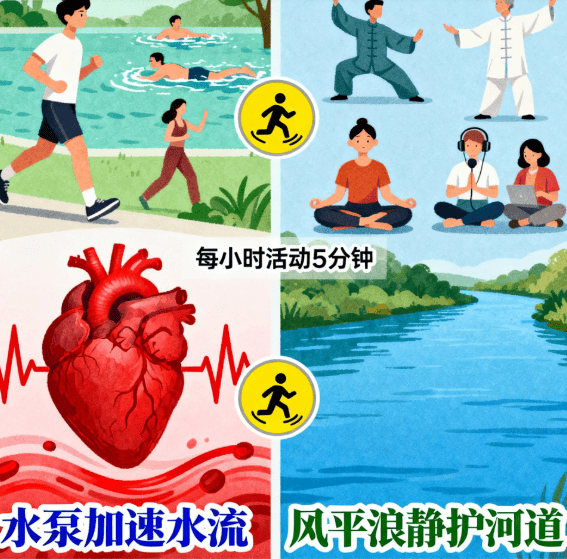 有氧运动最管用:快走、慢跑、游泳、太极拳、骑车这些,每周坚持个3-5次,每次30分钟以上,让心跳快一点,身上微微出汗。这样能让心脏更有劲,好比给河加了个“水泵”,让水流变快,有能力冲走刚开始的小淤堵。