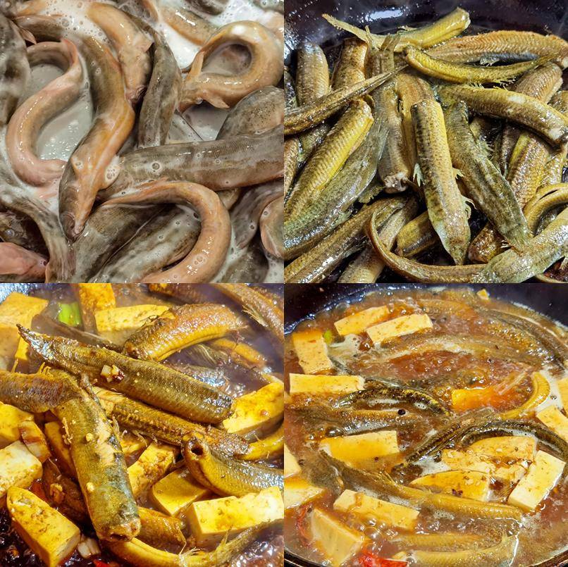4. 炖煮:把煎好的泥鳅倒回去,沿着锅边淋入料酒、生抽、老抽(上色),翻炒均匀。然后加入足量的开水,水量要没过泥鳅。