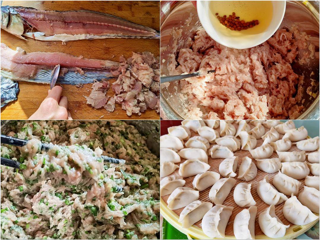 2. 调制肉馅:在鱼肉泥中分次加入花椒水(用开水泡花椒放凉),朝一个方向使劲搅拌,让鱼肉“吃”进水,这样馅料才会嫩滑。然后加入适量的肥瘦肉馅(比例大概是3:7的鱼肉和猪肉,加点猪肉更香),继续搅拌均匀。