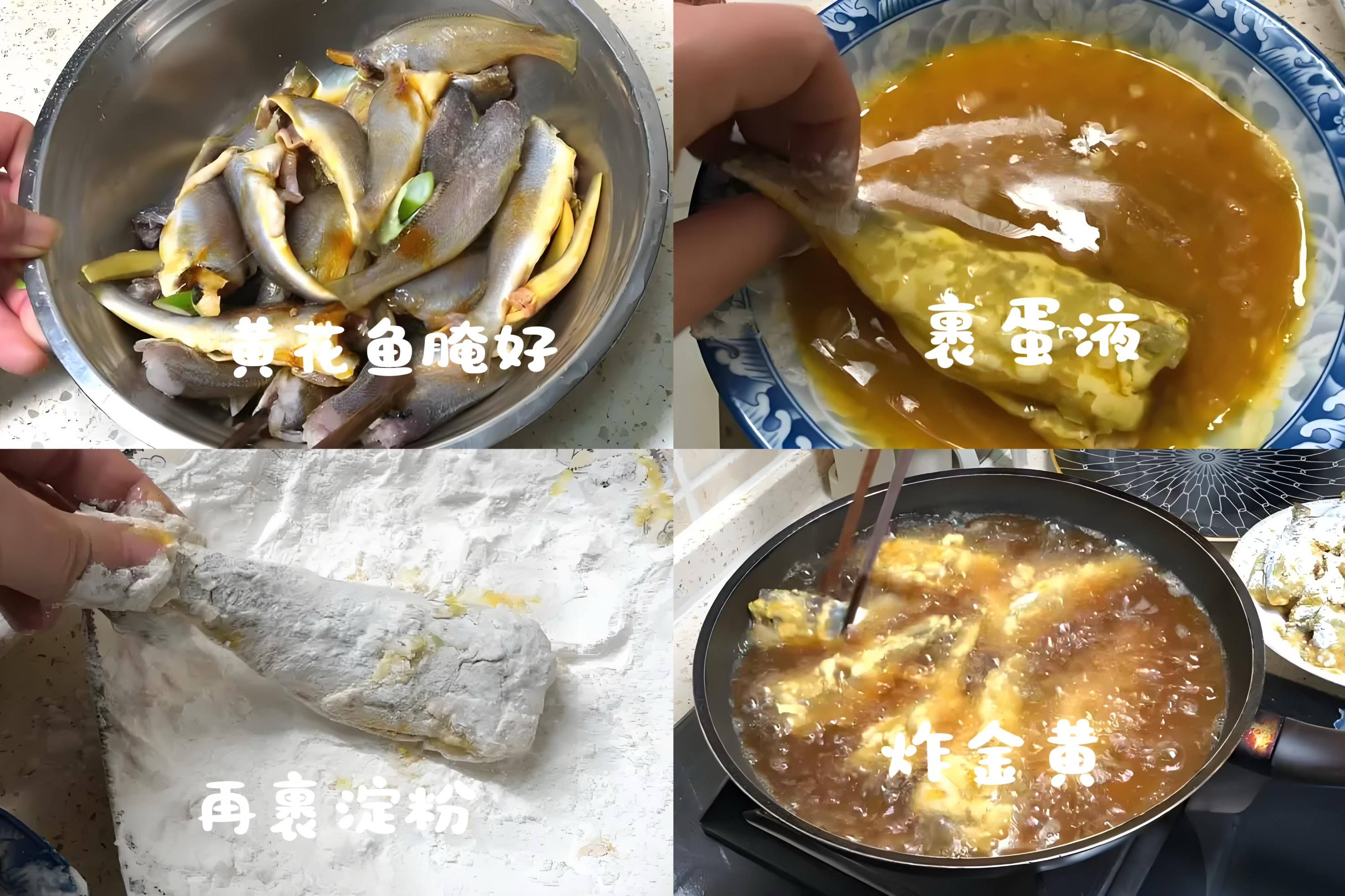 1. 腌制:小黄花鱼处理干净,加入葱段、姜片、料酒、盐、白胡椒粉,抓匀腌制半小时以上,让其充分入味。
