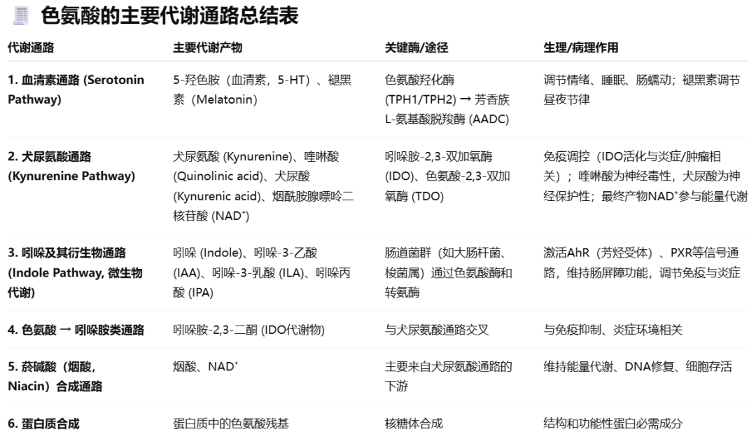 色氨酸是人体必需氨基酸之一,来源于饮食。它不仅参与蛋白质合成,还可作为多条代谢通路的前体,生成多种重要的代谢物,涉及 神经递质、免疫、能量代谢、肠-脑轴 等多个方面。