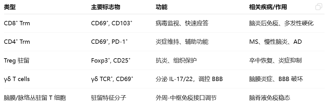 脑驻留T细胞的主要有五种类型,如下表所示: