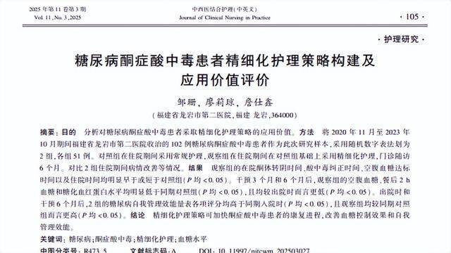 糖尿病酮症酸中毒患者精细化护理策略构建及应用价值评价,邹珊;廖莉琼;詹仕鑫,中西医结合护理(中英文),2025-03-25