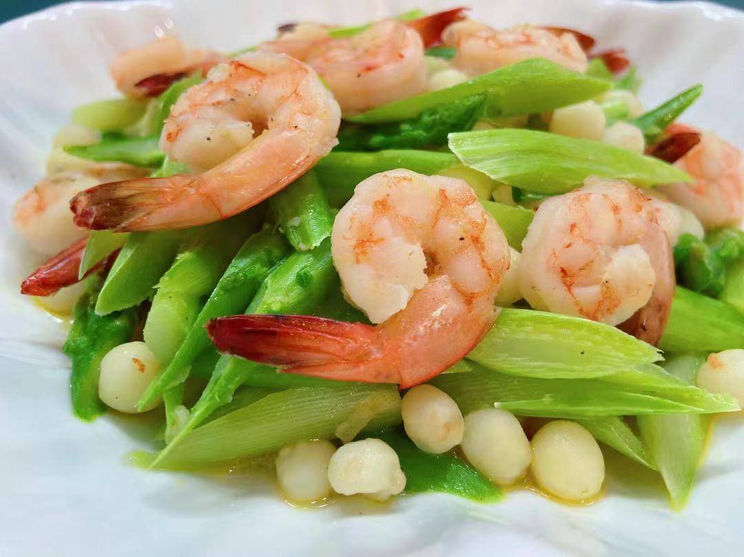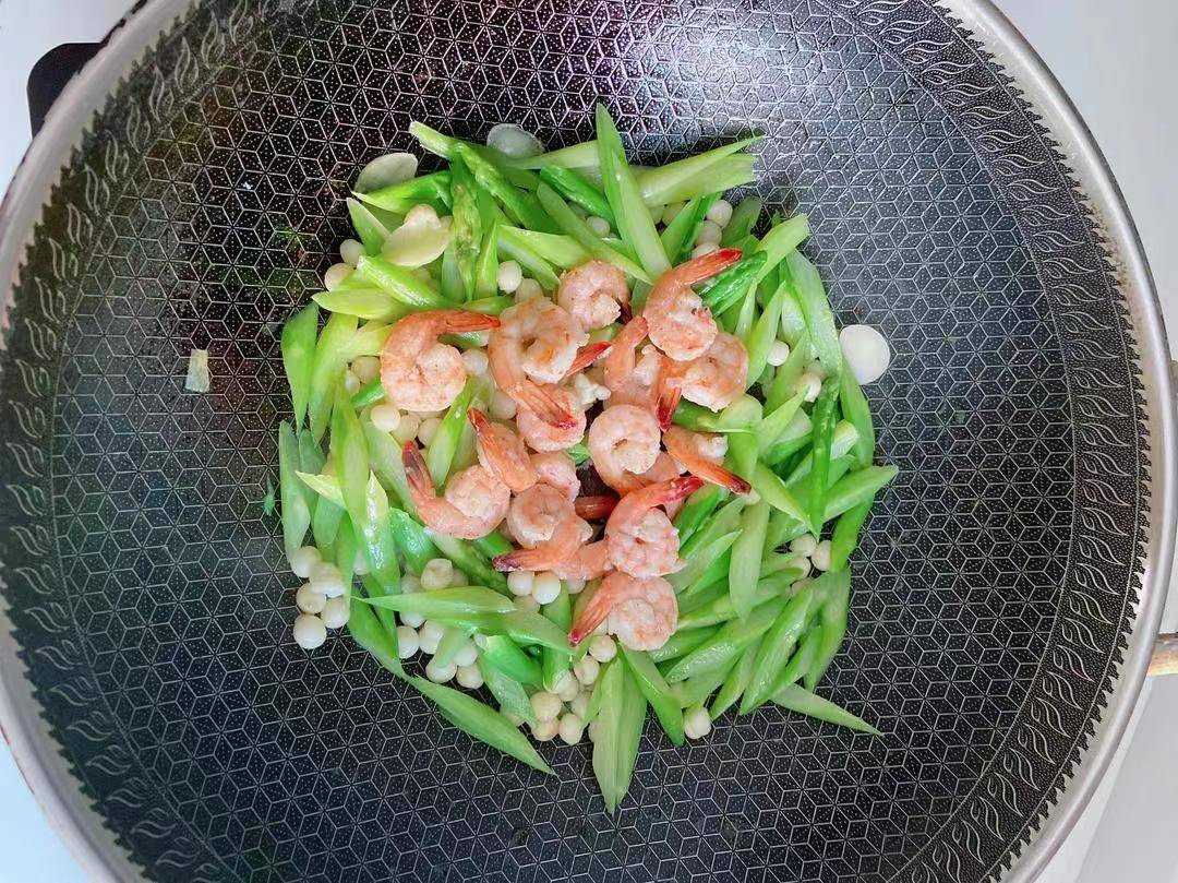 3、锅里倒水烧开,先把莴笋放里边煮半分钟,捞起来。再把虾仁倒进去,放些姜丝,煮到变色时捞出。