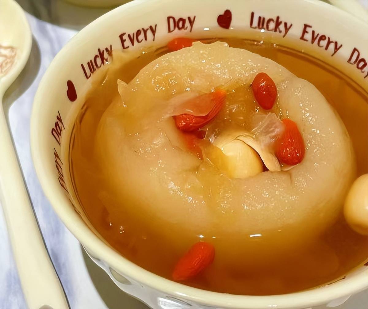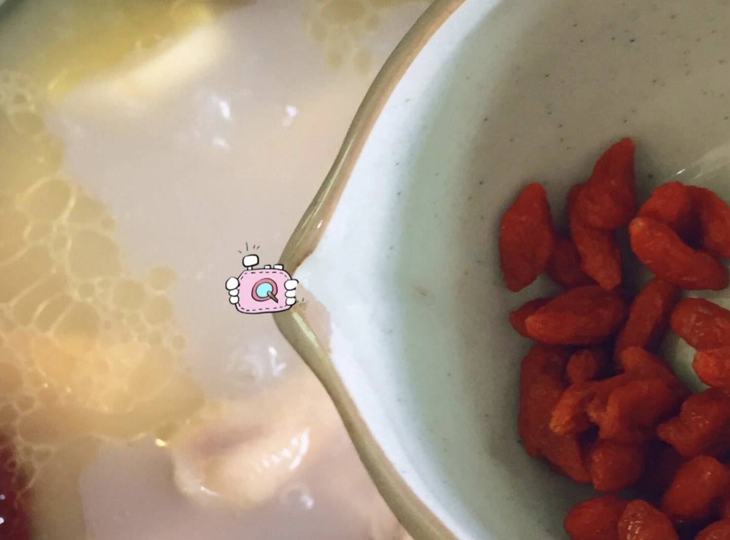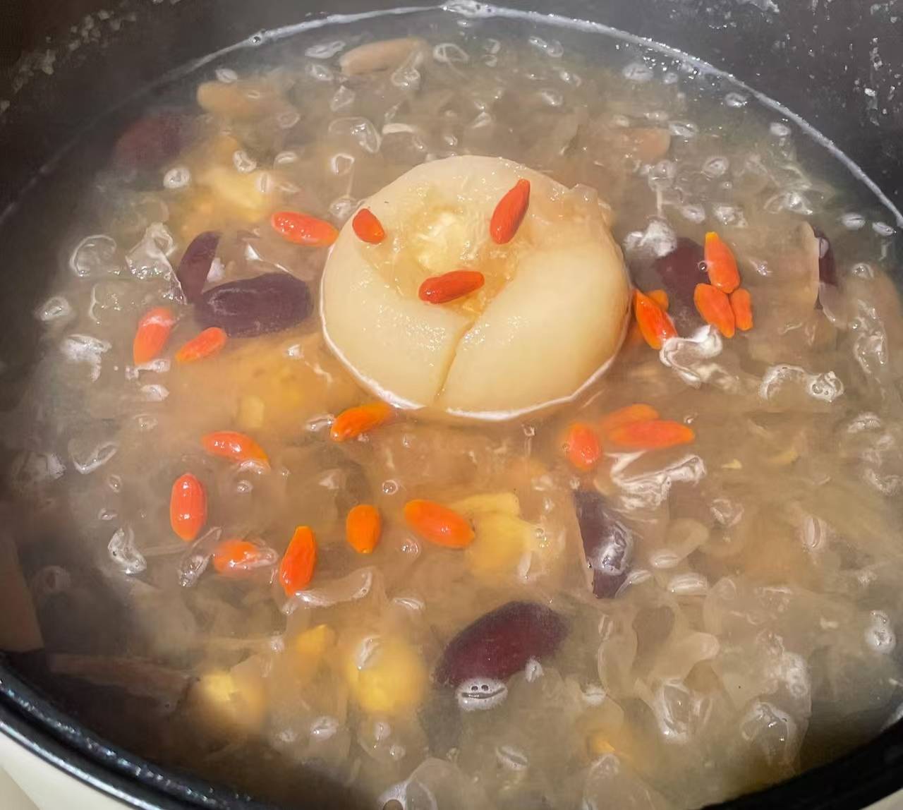 3、锅里放水,银耳和梨,枣都放进去,炖一个小时,令其彻底熟透,再撒些枸杞,冰糖,焖十分钟即可享用。