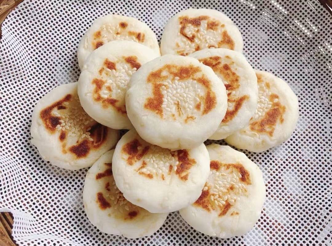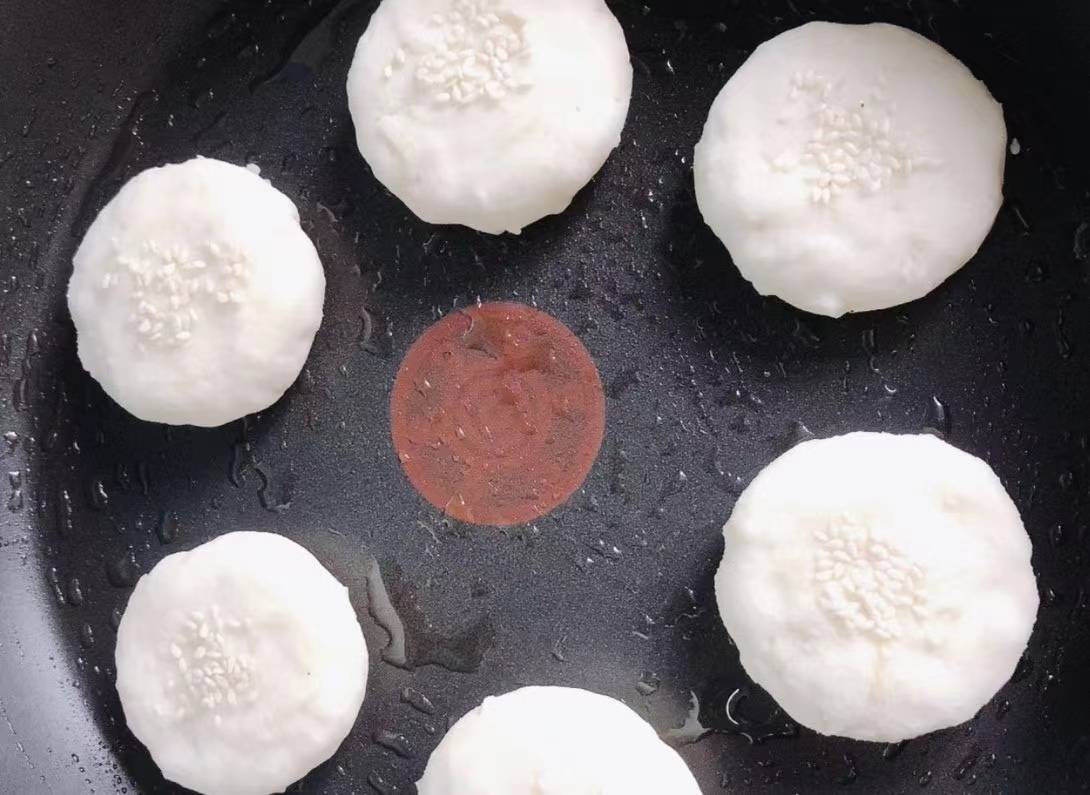 4、将其分成小剂子,逐一按扁,表面刷点水,撒上芝麻,在不粘锅里烙至金黄鼓起,即可盛出。