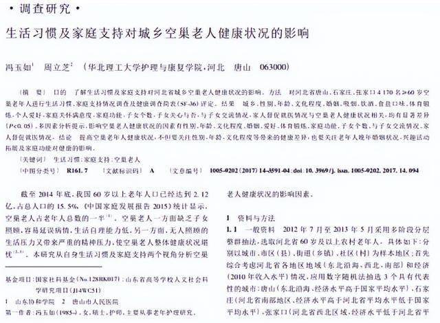 [1]冯玉如,周立芝.生活习惯及家庭支持对城乡空巢老人健康状况的影响[J].中国老年学杂志,2017