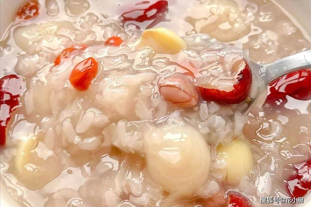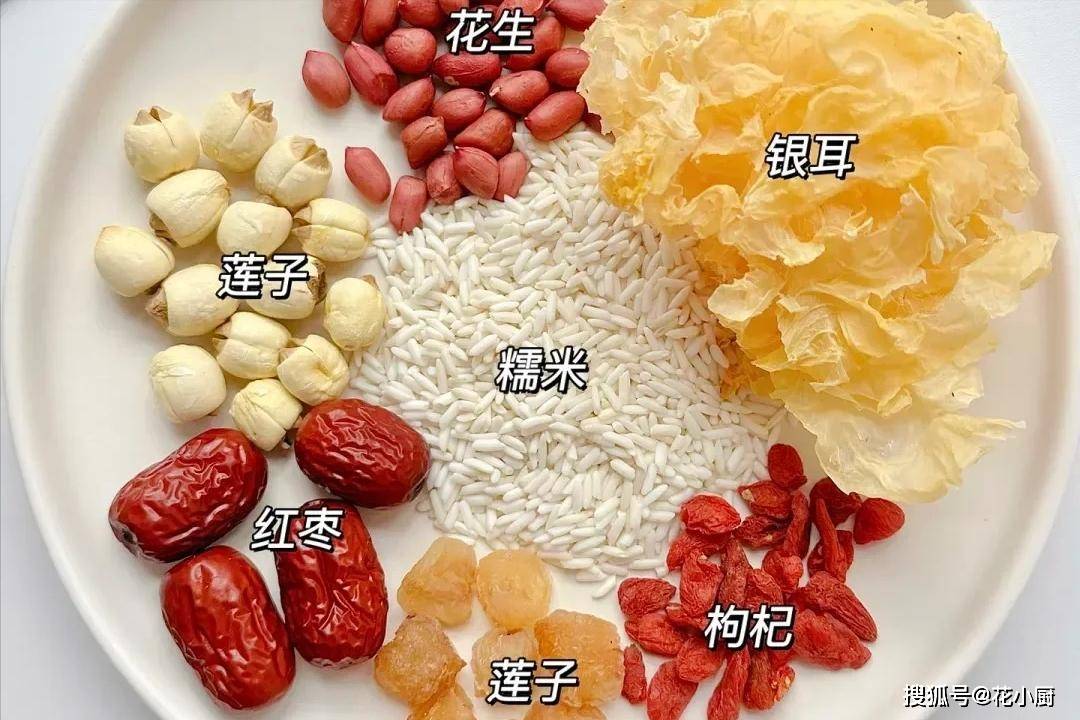 莲子能养心安神,桂圆可是补血的好东西,花生富含营养,糯米能健脾暖胃,银耳滋润皮肤,红枣就更不用说了,补气血一绝,枸杞则能养肝明目。这么多好东西凑一块儿,熬出来的粥能不好喝、没效果吗?
