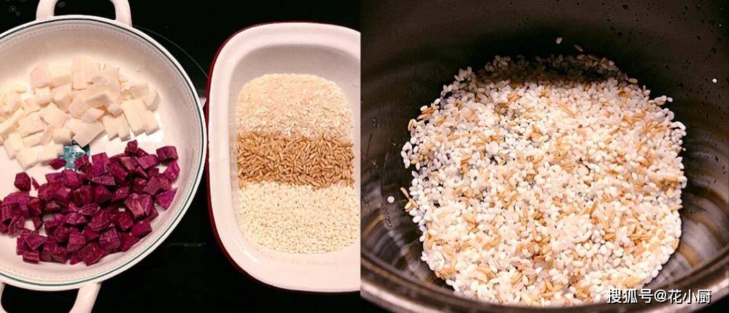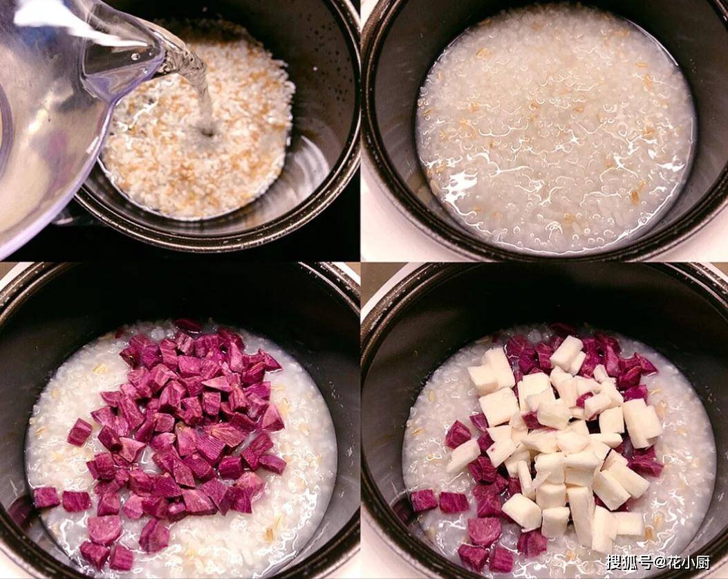 食材:大米50克、糯米50克、燕麦20克、山药去皮后50克、紫薯去皮后70克、清水800毫升、冰糖适量