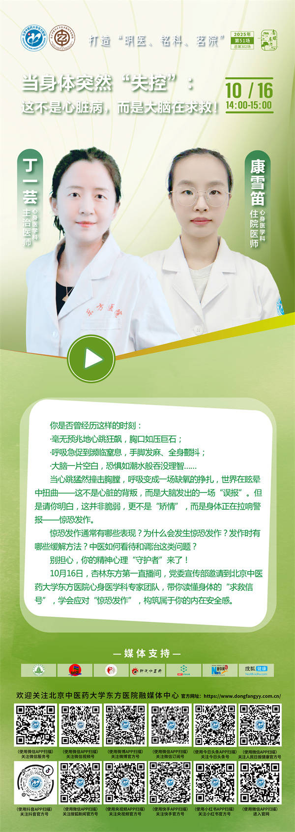 你是否曾经历过这样的时刻:感觉心跳加快、呼吸急促,甚至会觉得喘不上气,有时还会出现濒死的感觉,但就算去急诊、心内科反复检查也没有发现器质性的病变,这究竟是为什么?什么是惊恐发作?它的典型表现是什么?有诱因吗?该如何缓解呢?中医该如何看待和改善它?当生活中各类事件的压力不断积攒,到最后不得不满溢出来时,身体就开始拉响警报了,可是反复就医检查都找不到具体的原因。2025年10月16日周四14:00-15:00,北京中医药大学东方医院“杏林东方第一直播间”,心身医学科丁一芸主治医师和康雪笛医师将和您一起聊聊惊恐发作。