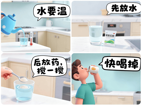 后放药:准备好温水后,再将蒙脱石散倒入水中服用。