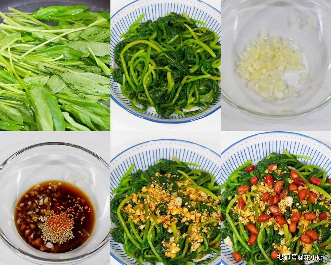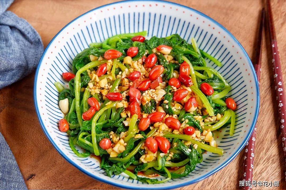 3、摆盘,把调好的碗汁均匀地淋在菠菜上,然后再撒上香喷喷的炸花生。这炸花生可是这道菜的灵魂之一,咬一口,又香又脆,和菠菜搭配在一起,口感层次可丰富了。撒完花生之后,别急着吃,先让菠菜在碗汁里泡一会儿,让它充分吸收调料的味道。