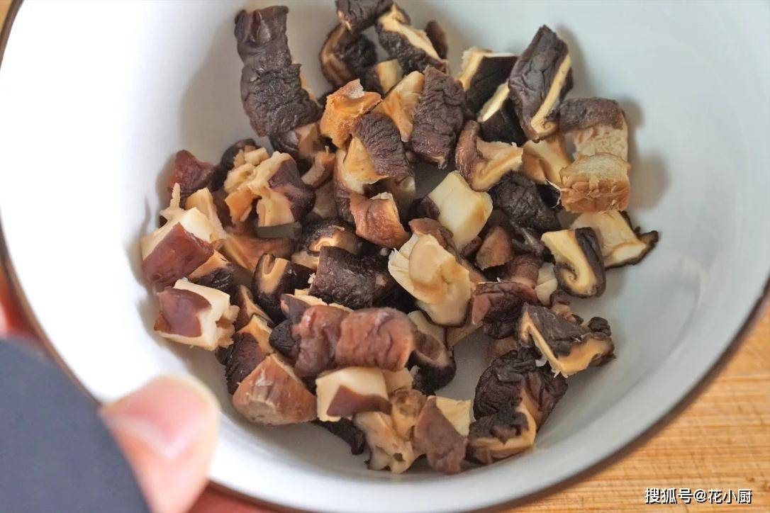 1、干香菇来上 5 朵,把它好好清洗清洗,洗干净之后给它搁温水里泡发。泡发好了就把香菇拿出来,用手使劲儿挤干水分,然后切成小丁放一边备用。