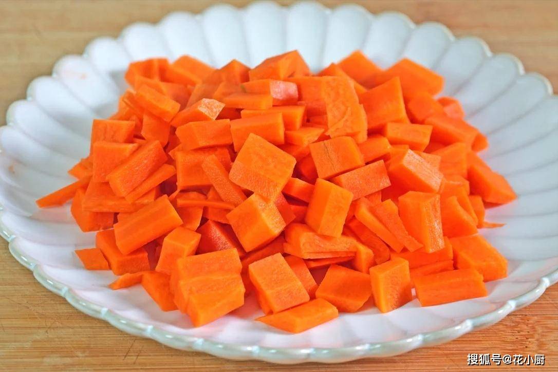 3、胡萝卜也来一根,同样洗干净,把皮一削,先切成厚片,再切成小丁,和山药放一块儿等着下锅。