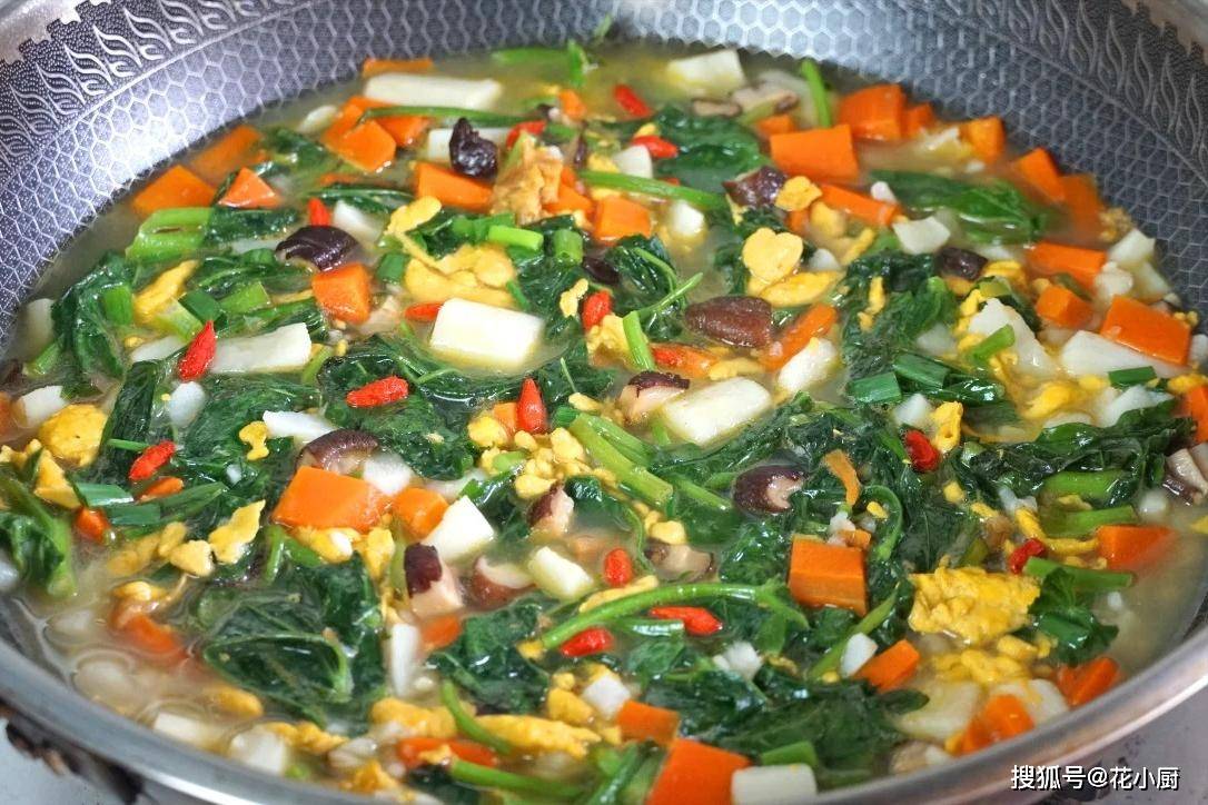 等 5 分钟到了,打开锅盖看看,山药和胡萝卜都煮熟了,把刚才煎好的鸡蛋倒进去,再把切好的红薯叶也倒进去,接着煮 1 分钟。