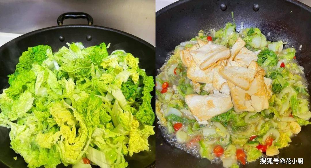 4、大白菜炒软之后把煎好的豆腐倒进去。这时候再加点水,开始炖煮。就这么小火咕嘟咕嘟炖个 5 分钟,让白菜和豆腐的味道充分融合在一起。