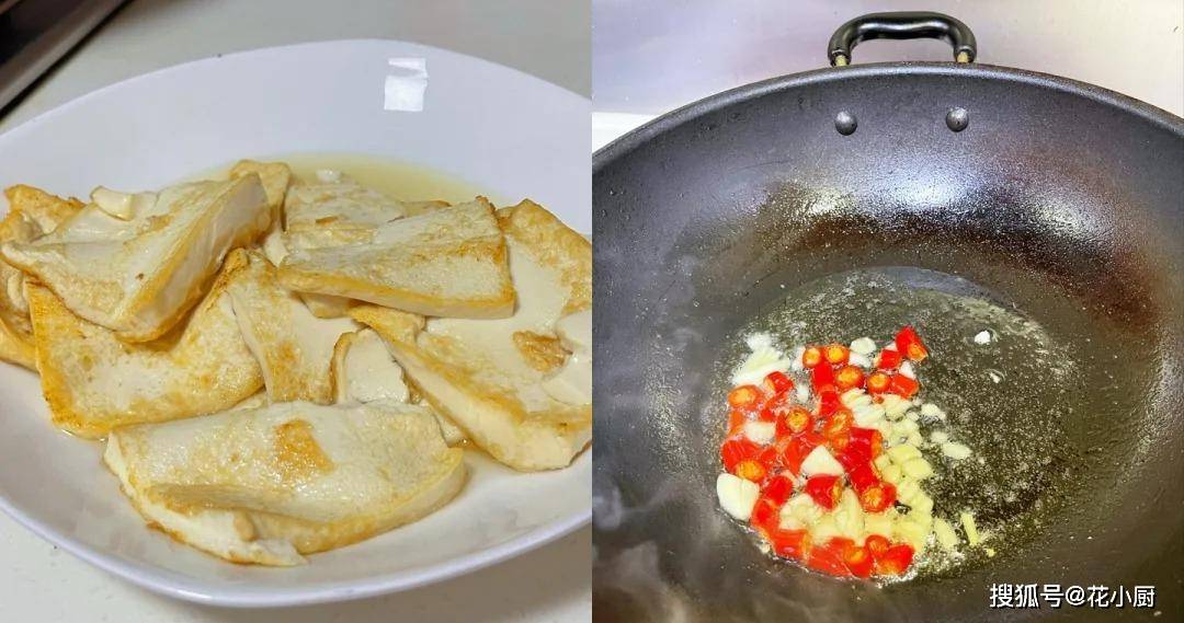 2、豆腐切成片,放到锅里煎一煎。煎的时候可得注意火候,中小火慢慢煎,让豆腐两面都变成金黄的颜色。这煎好的豆腐,看着就特别有食欲,就像一个个小金块似的。煎好之后也放一边等着下锅。
