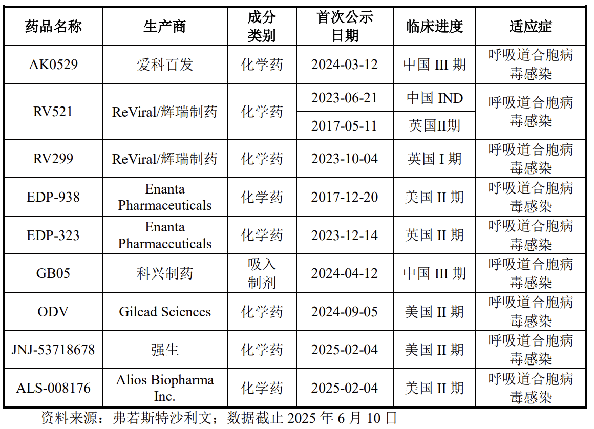 现阶段,全球范围内还有包括辉瑞、吉利德、强生等MNC也在推进RSV治疗药物的研发。国内药企中,歌礼制药(01672.HK)的ASC10、旺山旺水的VV116也在针对RSV治疗开展相关研发。