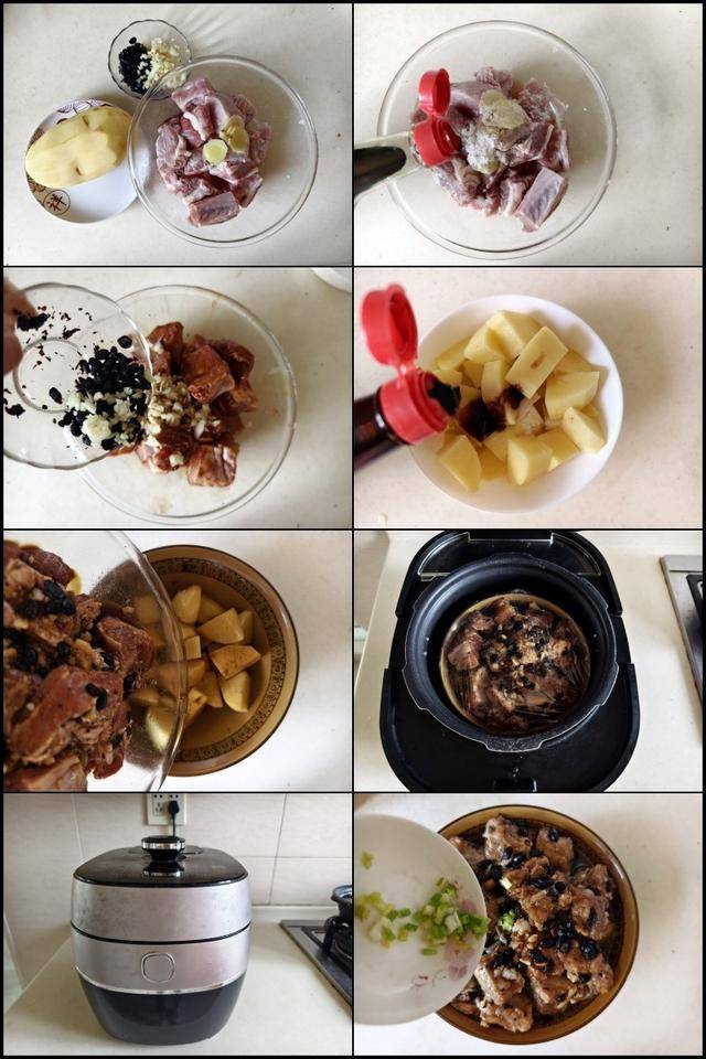 制作:1. 准备好原材料,将肋排剁成麻将大小的块, 土豆去皮后也切成块备用; 2. 排骨块加入少许盐、淀粉、料酒和生抽等调味料拌均匀腌制5分钟; 3. 再加入洗净的豆豉和蒜末调味料拌均匀腌制3分钟; 4. 土豆块加入少许盐和生抽拌均匀腌制5分钟备用; 5. 将腌制好的土豆放入钵中,再放上排骨块; 6. 电蒸锅放入适量的水,将菜盘放进电蒸锅锅中; 7. 按下电蒸锅上蒸的功能键,大火蒸上25分钟; 8. 蒸好的拿出来撒上少许葱花即可。