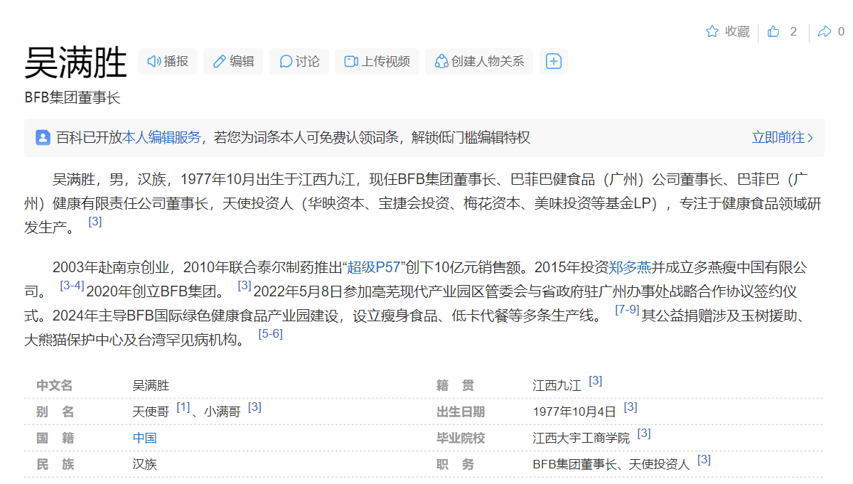 知情人士透露:吴满胜与巴菲巴健康科技集团法定代表人吴满元是兄弟关系。百度百科显示:吴满胜为BFB集团董事长、巴菲巴健食品(广州)公司董事长、巴菲巴(广州)健康有限责任公司董事长,天使投资人。由此可见所谓“并非直接关联的运营主体”的理由并不成立。
