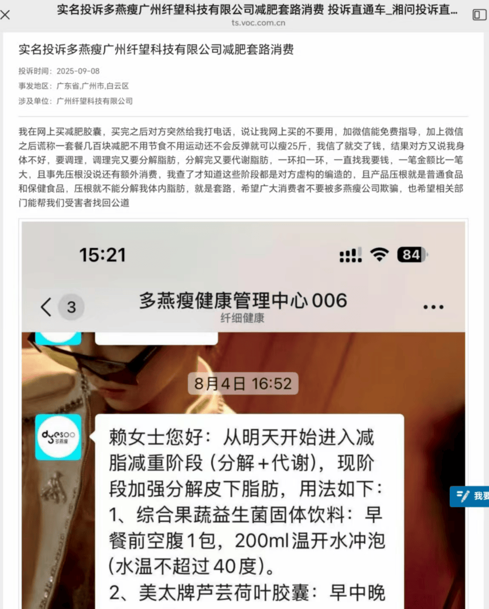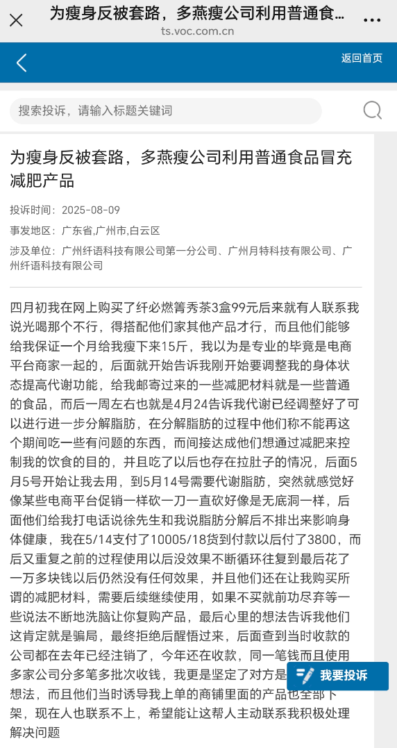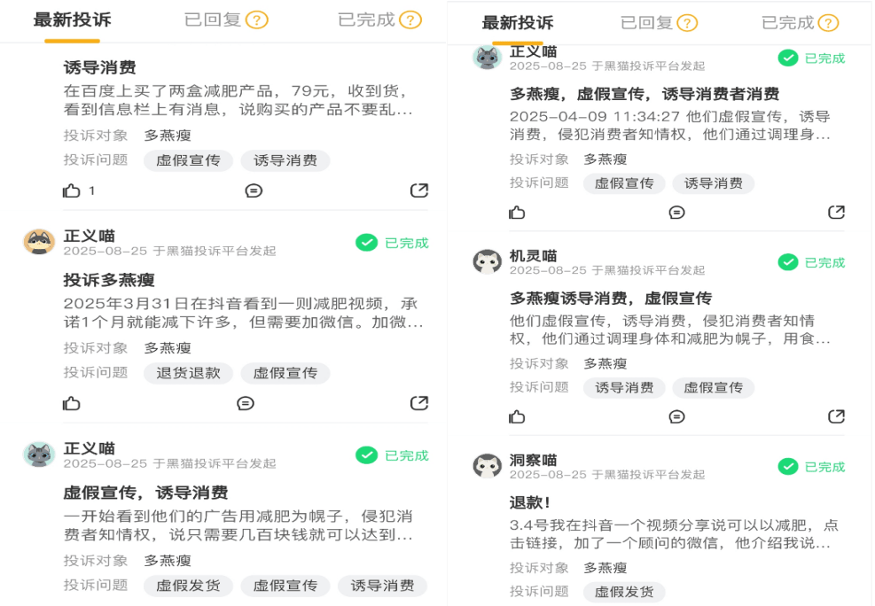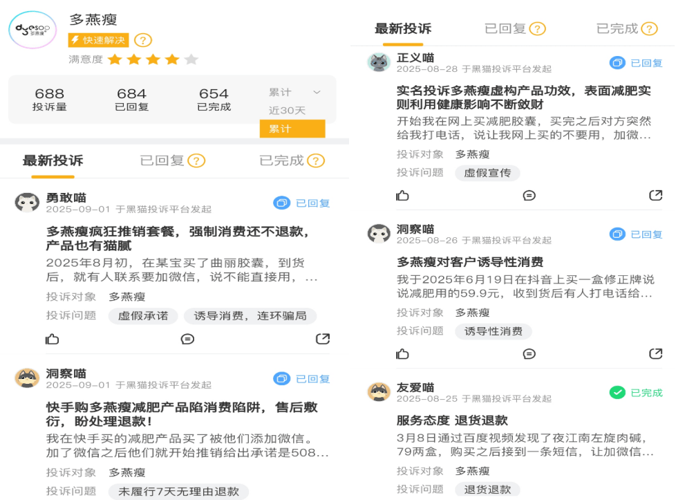 回顾多燕瘦过往舆情,消费者投诉主要集中在虚假宣传、诱导消费和退款难等方面。在黑猫投诉平台上,相关投诉多达数百条,众多消费者讲述着相似的经历:起初被“轻松减肥、不反弹”“专业指导、科学瘦身”等宣传语吸引,购买基础产品后,所谓的“专业顾问”便以消费者体质特殊、当前产品效果不佳等理由,不断诱导其购买高价套餐,从几百元逐步升级到数万元。可最终,减肥效果往往不尽人意,体重纹丝未动或反弹严重 ,当消费者要求退款时,却遭遇商家以“产品已开封”“体质差异”等各种借口推脱,甚至直接失联,让消费者维权无门。