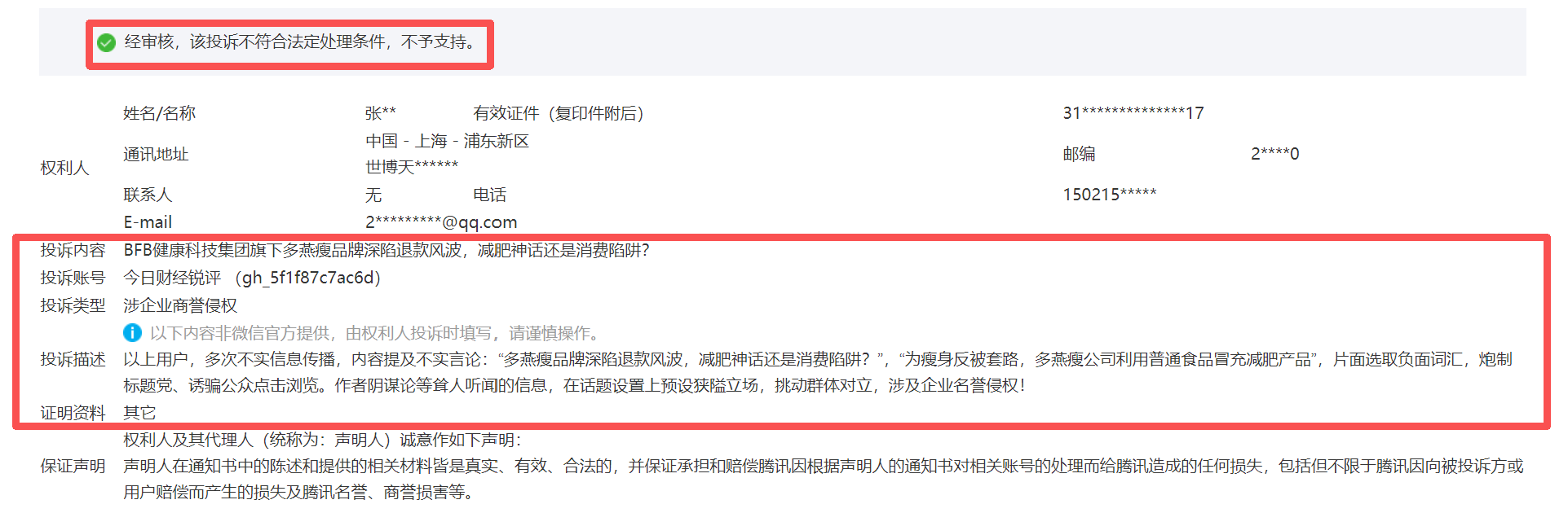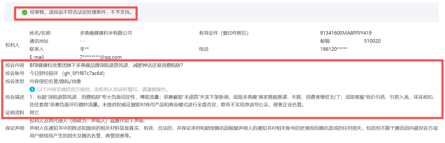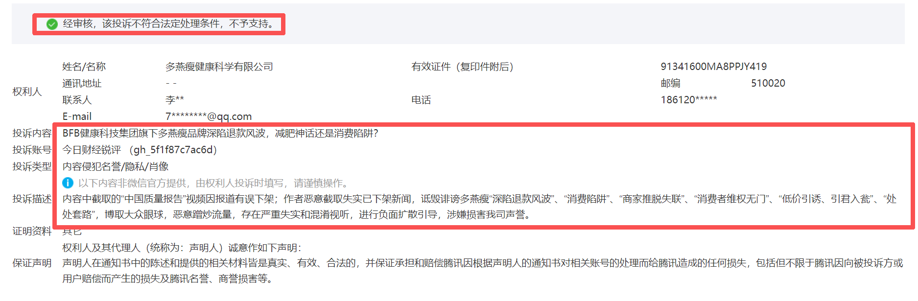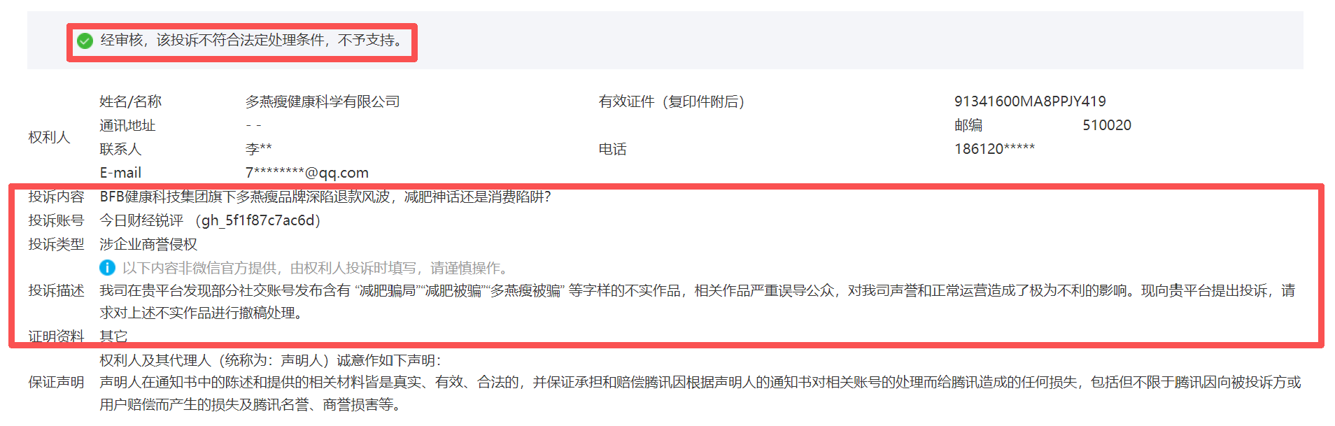然而该篇文章发表仅仅5个小时后,就收到多燕瘦健康科学有限公司的网络投诉。称内容中截取的“中国质量报告”视频因报道有误下架;作者恶意截取失实已下架新闻,诋毁诽谤多燕瘦“深陷退款风波”、“消费陷阱”、“商家推脱失联”、“消费者维权无门”、“低价引诱、引君入瓮”、“处处套路”,博取大众眼球,恶意蹭炒流量,存在严重失实和混淆视听,进行负面扩散引导,涉嫌损害我司声誉。最终该投诉被驳回。