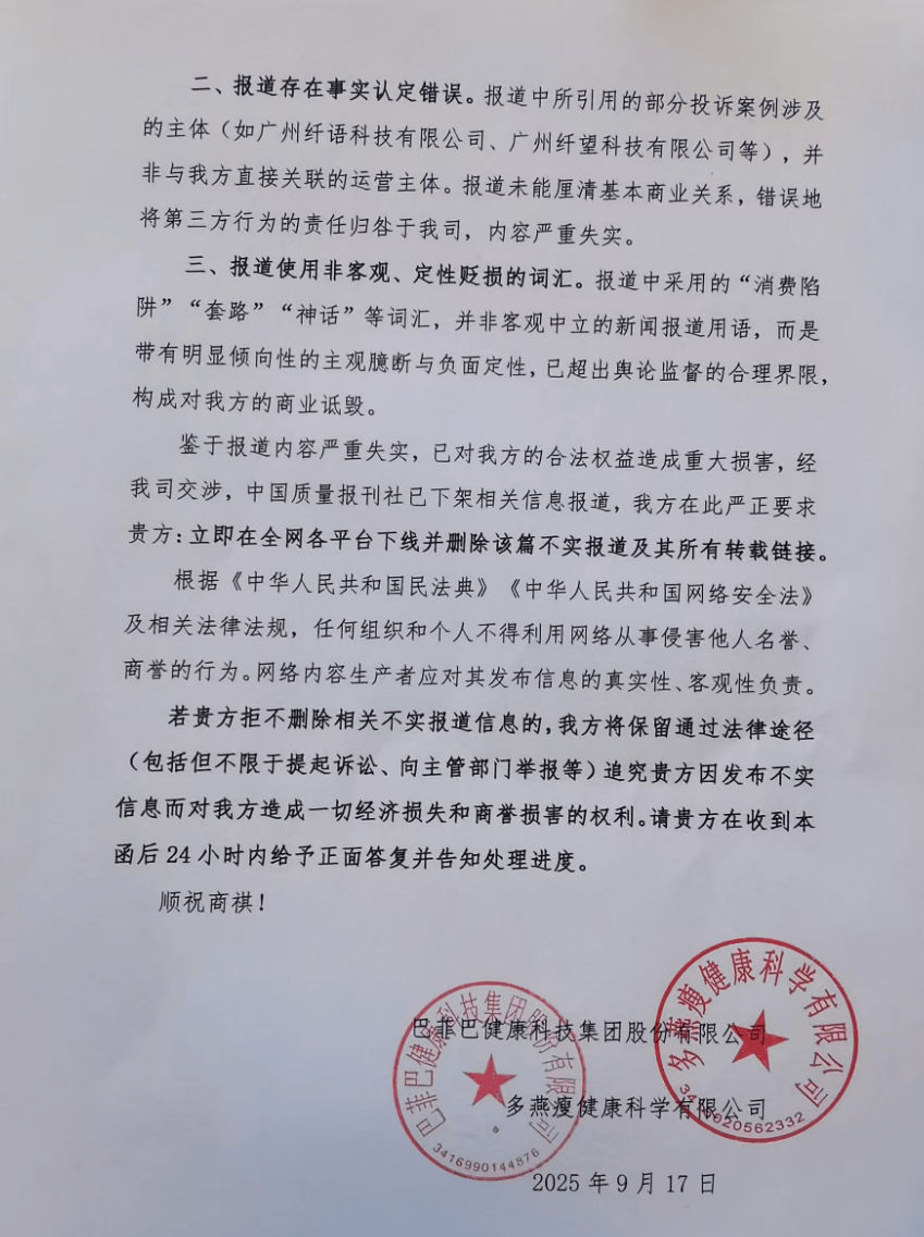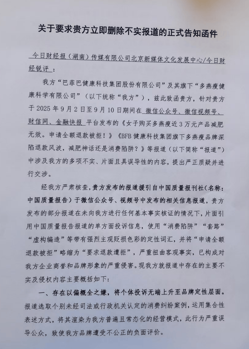 除了网络投诉,9月19日,今日财经收到“巴菲巴健康科技集团股份有限公司“(以下简称巴菲巴科技集团)及其旗下“多燕瘦健康科学有限公司”(以下简称多燕瘦公司)的“关于要求贵方立即删除不实报道的正式告知函件”。