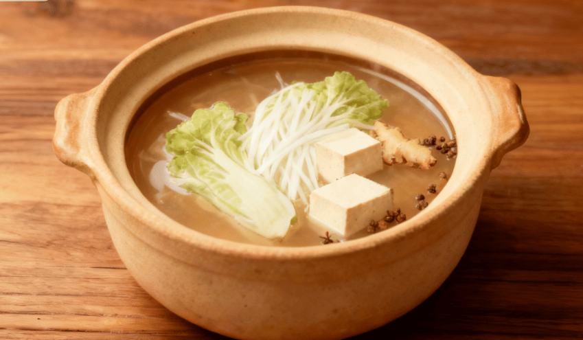 - 冷水下锅,先放生姜、白萝卜煮 5 分钟,再加入白菜、豆腐、花椒,大火煮开后转小火炖 15 分钟。