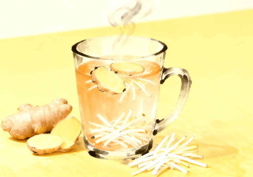 - 白萝卜丝、生姜丝用开水冲泡,焖 5 分钟。
