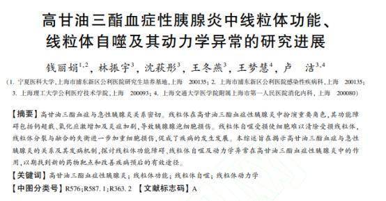 高甘油三酯血症性胰腺炎中线粒体功能、线粒体自噬及其动力学异常的研究进展 钱丽娟,林振宇,沈萩彤,王冬燕,王梦慧, 卢 洁 同济大学学报(医学版) 2025-09-25
