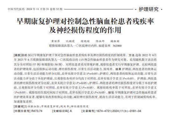 [1]黄丽萍,孔敏霞,陈晓瑜,等.早期康复护理对控制急性脑血栓患者残疾率及神经损伤程度的作用[J].中国当代医药,2024