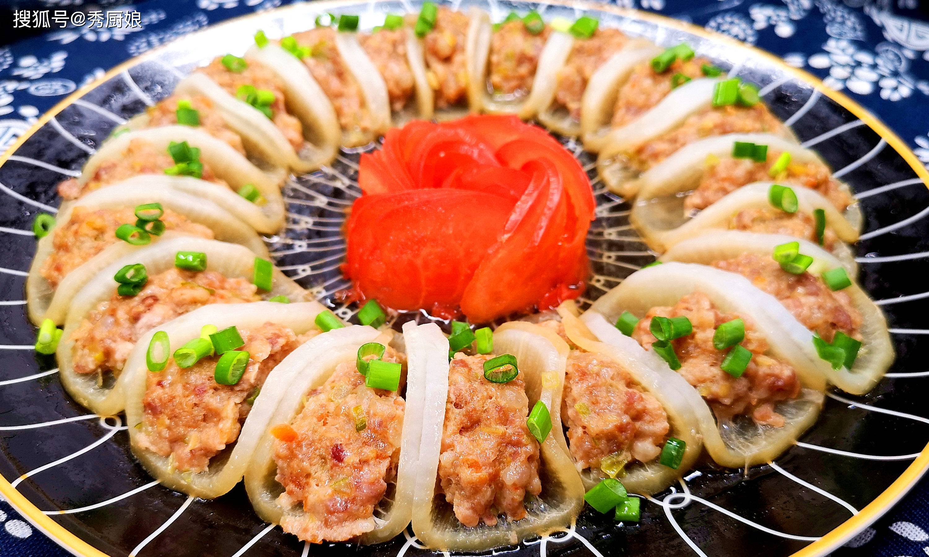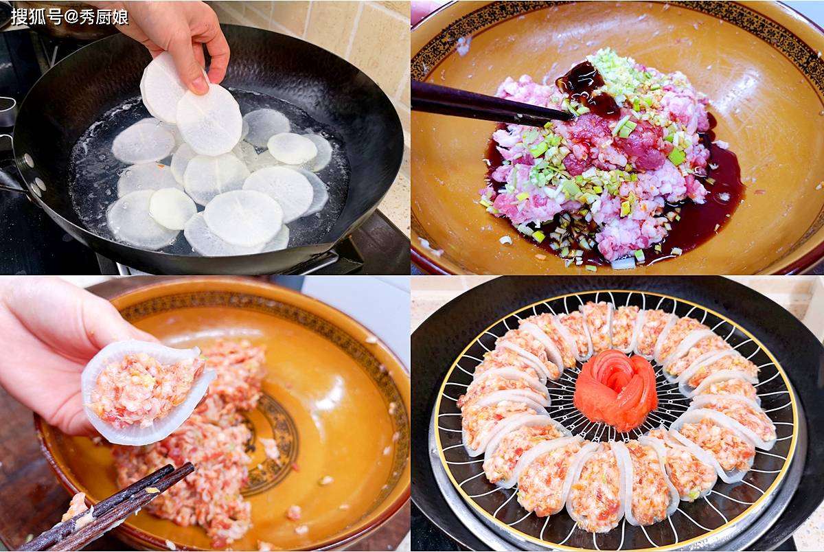 这道菜颜值高,味道好,萝卜片经过蒸制后变得透明软糯,吸收了肉汁的鲜美。焯过水的萝卜少了辛辣味,多了清甜,与肉馅的搭配相得益彰,清爽不油腻,宴客或家常吃都很合适。