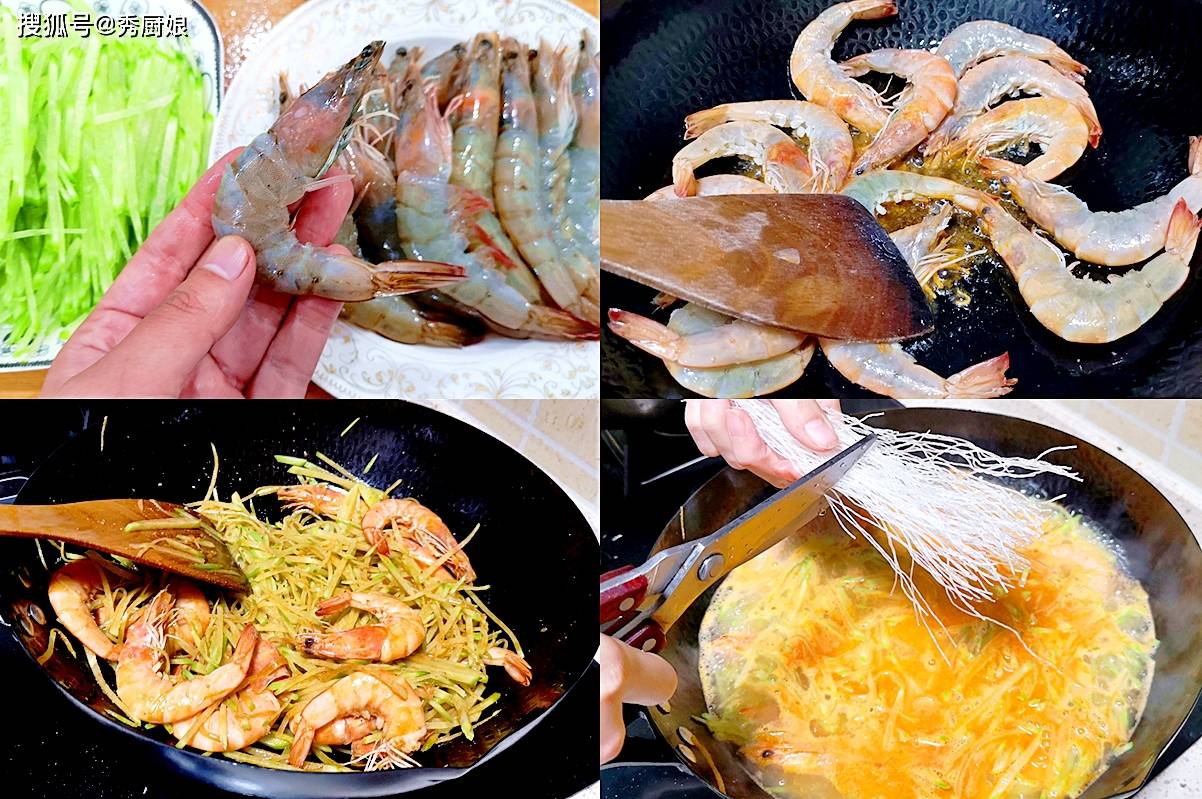 1. 青萝卜切丝,龙口粉丝用温水泡软,大虾洗净去须。