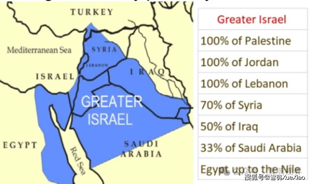 大以色列愿景包括:100%巴勒斯坦,100%约旦,100%黎巴嫩,70%叙利亚,50%伊拉克,33%沙特,埃及到尼罗河。