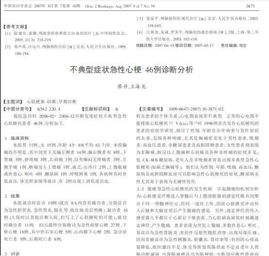 [1]廖丹,王海龙.不典型症状急性心梗46例诊断分析[J].中国误诊学杂志,2007